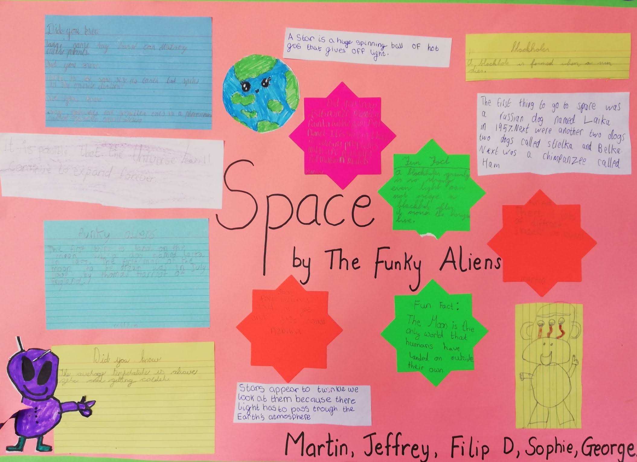 The children is 5th class spent the month of January learning all about space with Ms. Kenny, who was on teaching practice in Mrs. Dillon’s class. They worked in groups to create these very attractive projects.